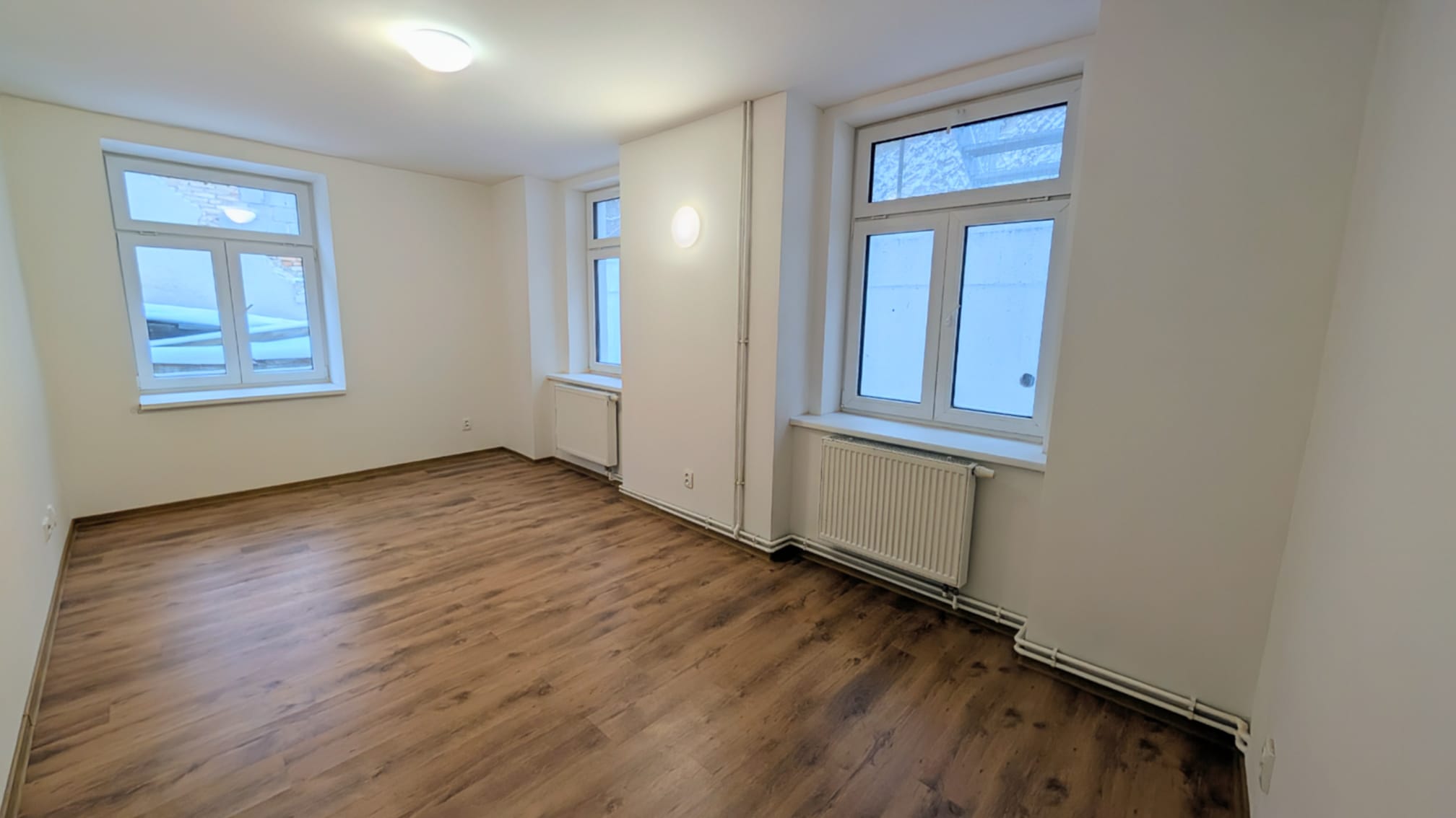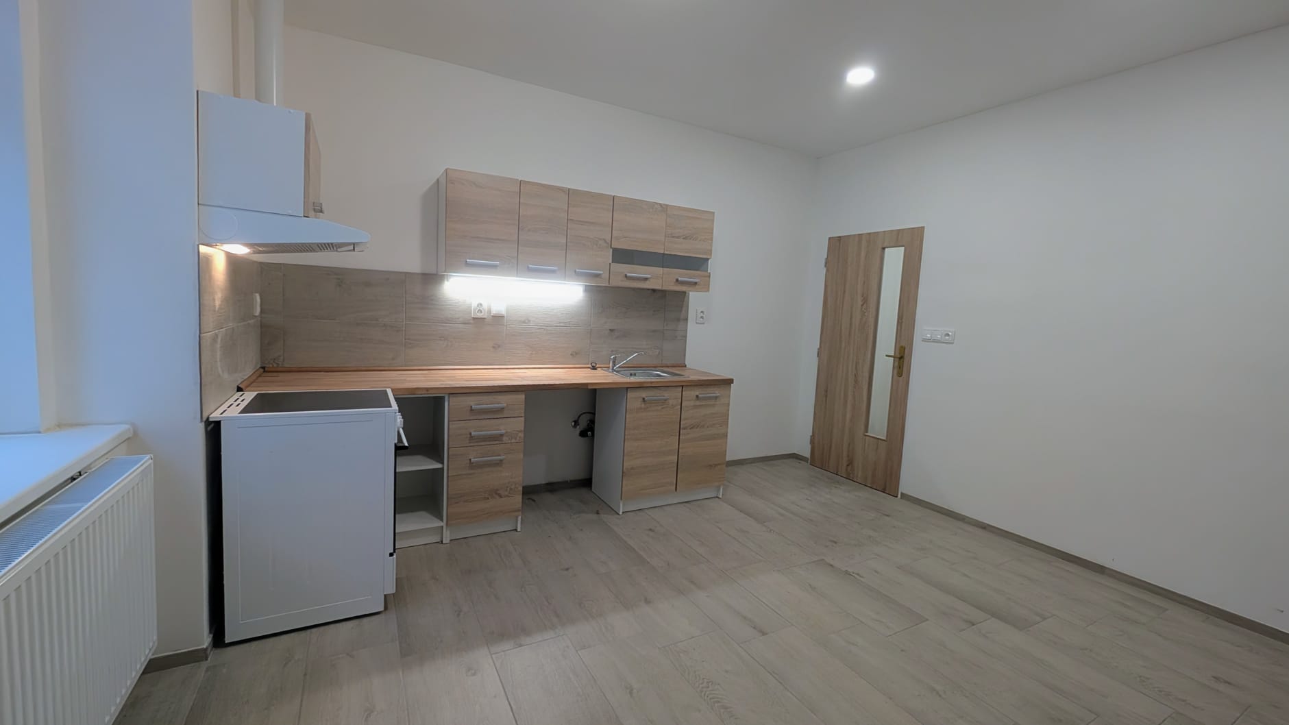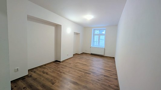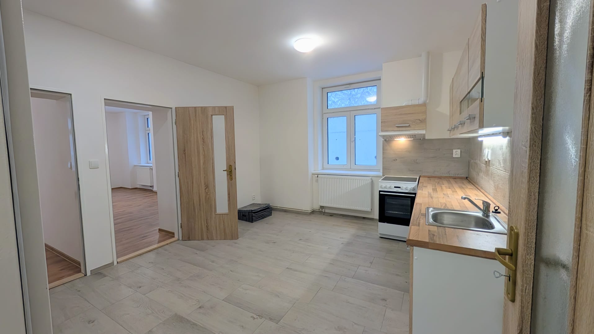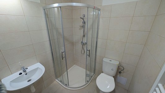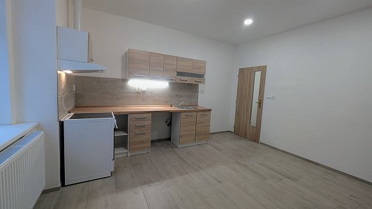 Byt disponuje předsíní, koupelnou se sprchovým koutem a toaletou, kuchyní s obývacím pokojem. Kuchyň je vybavena kuchyňskou linkou vybavenou sklokeramickou varnou deskou, troubou a digestoří. K dispozici jsou dva menší , samostatné pokoje, které lze využít jako ložnici nebo pracovnu.
