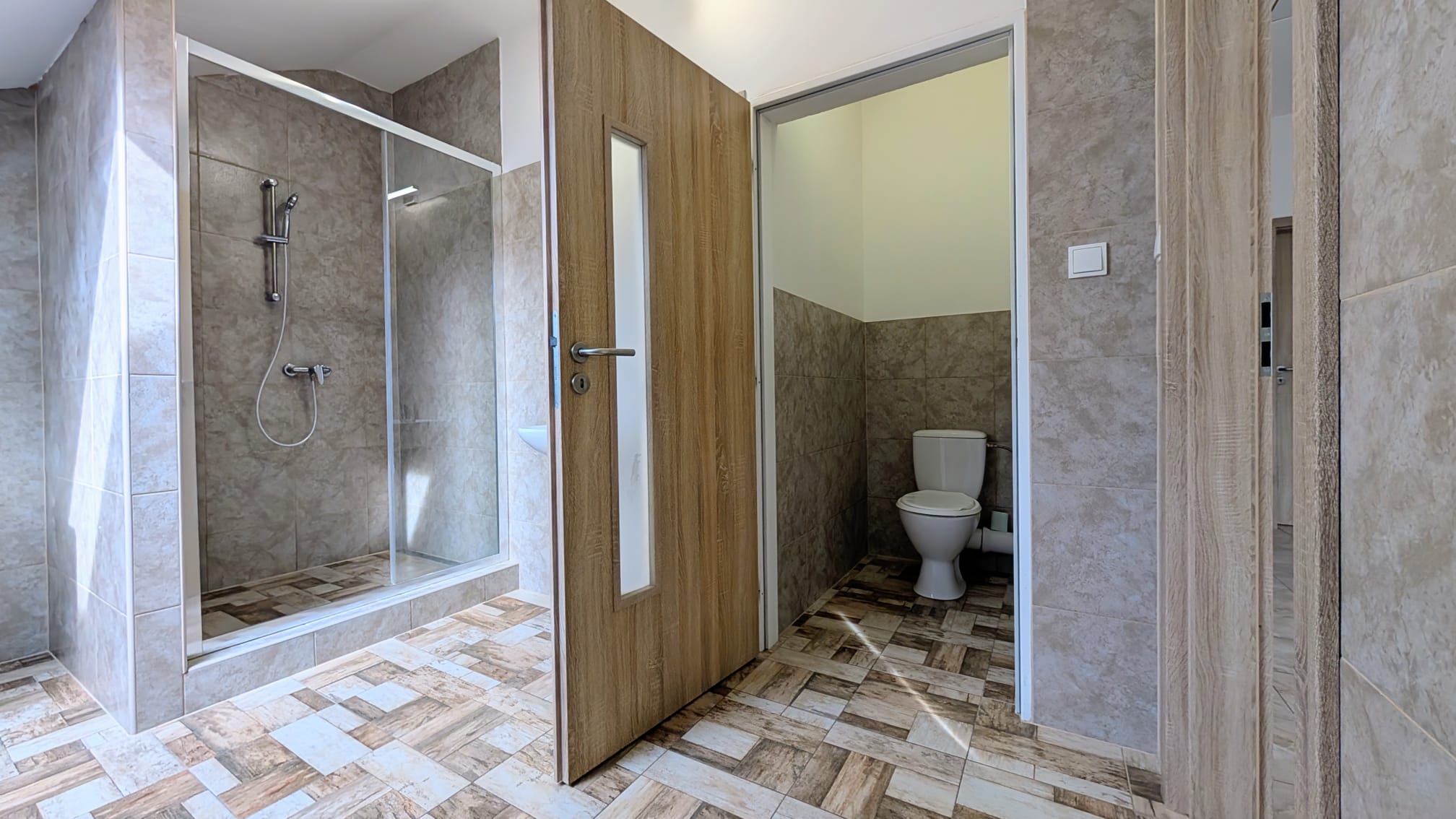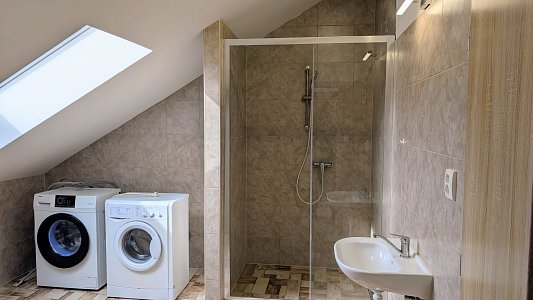 Vytápění i ohřev teplé vody jsou zajištěny tepelným čerpadlem, což přináší úsporný a moderní provoz bytu.