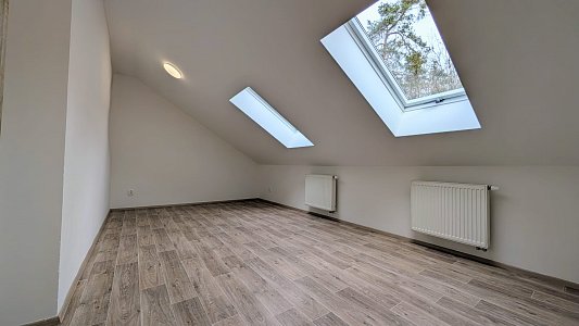 Velkou předností tohoto bytu je jeho orientace na všechny světové strany, díky které je krásně prosvětlený po celý den. Jedná se o příjemné podkrovní bydlení s dostatkem prostoru pro rodinu i pohodlné zázemí pro práci z domova.